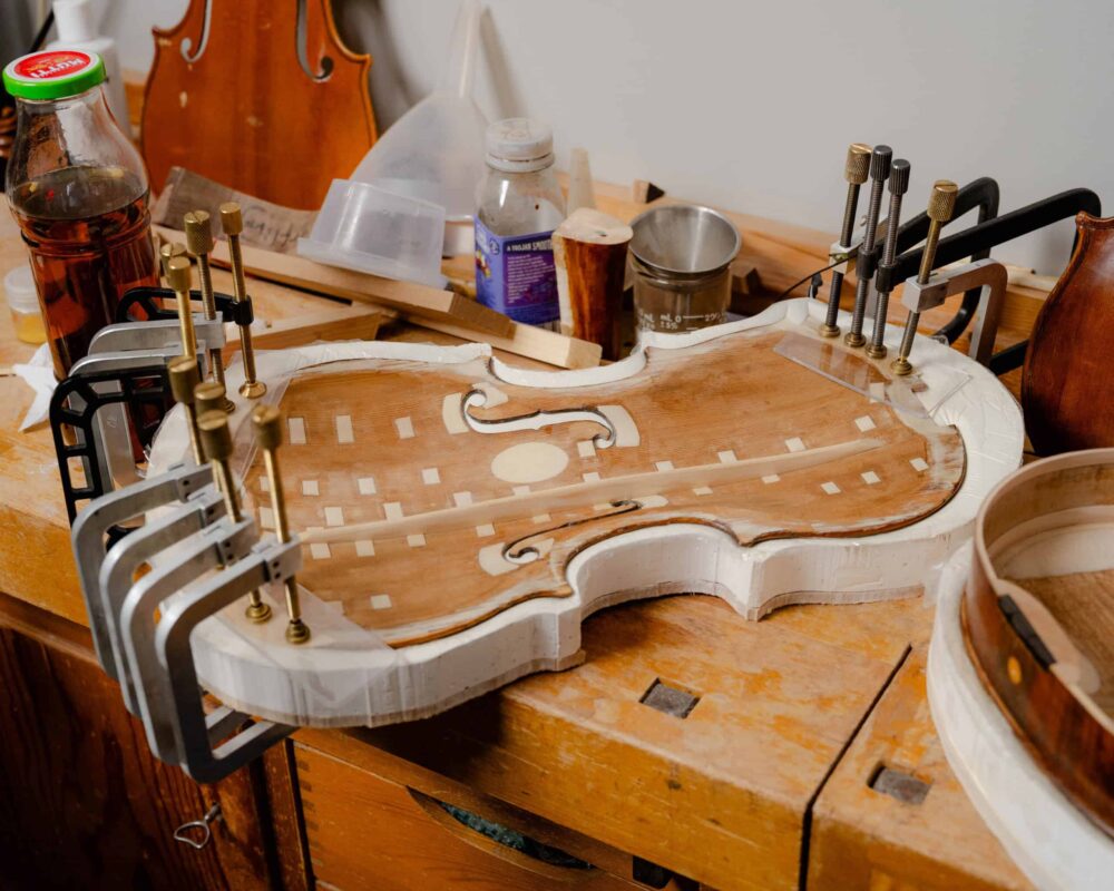 Violins catch the light in Helen Michetschläger's Manchester studio