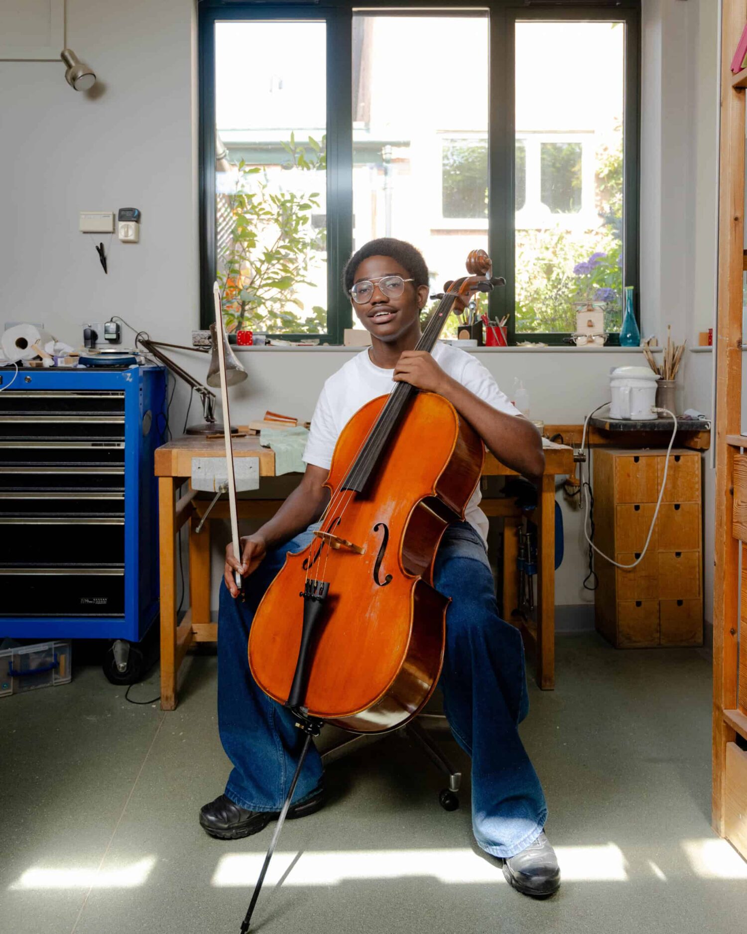 Jason sits with his donated cello
