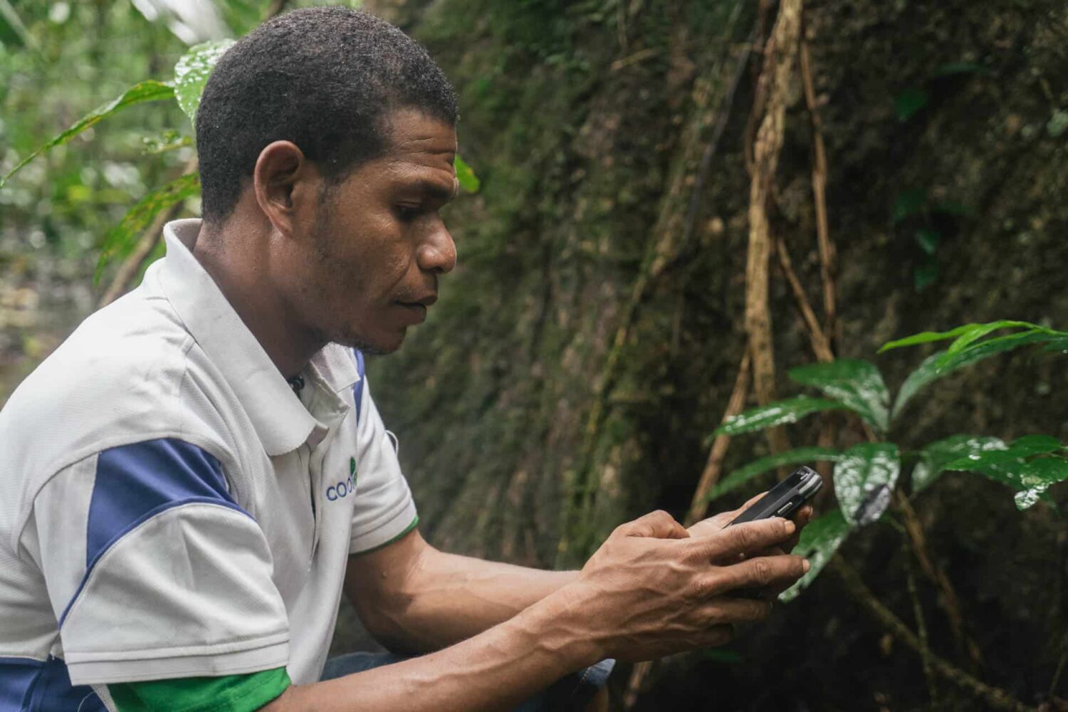 Biodiversity officer Nicky Roma, from Papua New Guinea, collects image and location data to cross-reference with satellite monitoring. Image: Cool Earth