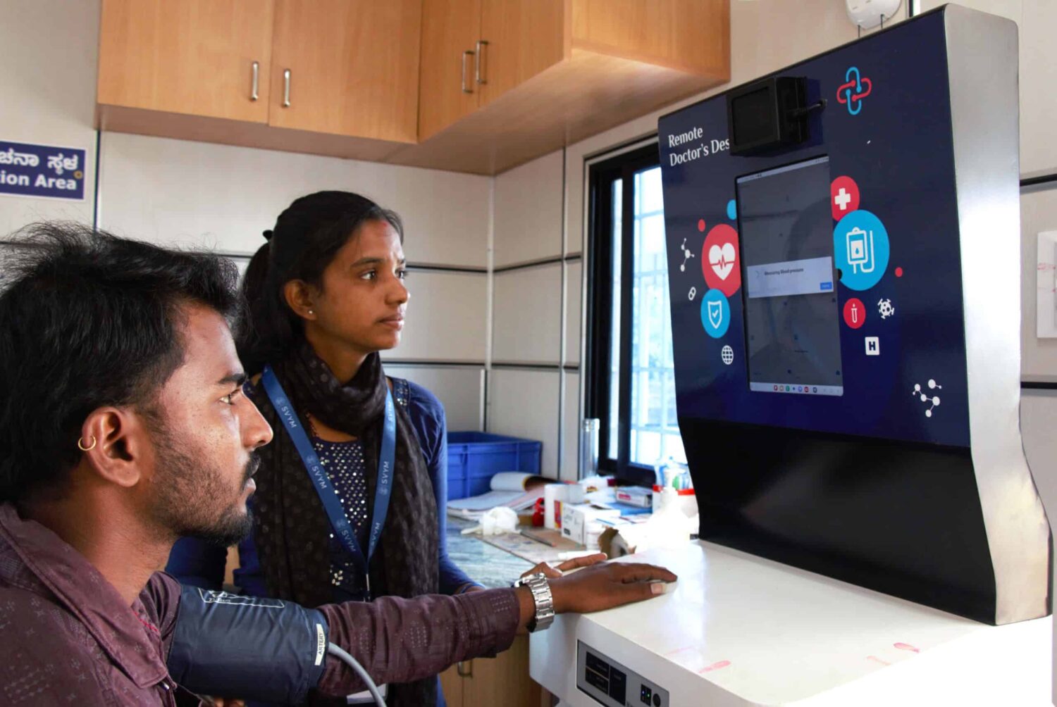Village health worker Bhanumathi (with blue lanyard) tests blood pressure at the Basavanagiri Haadi Tele Health Centre