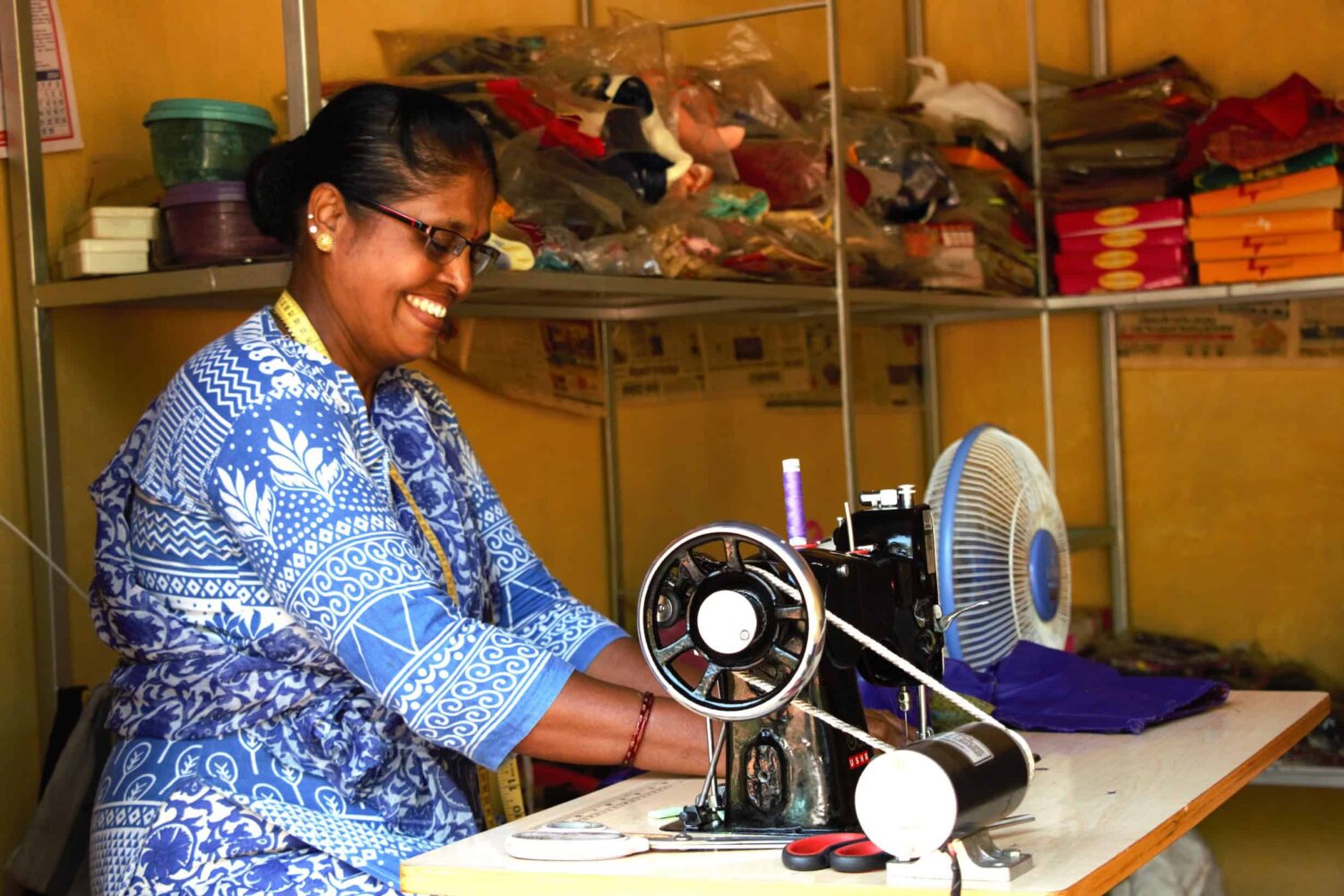 Mrs Vijay with her solar-powered sewing machine