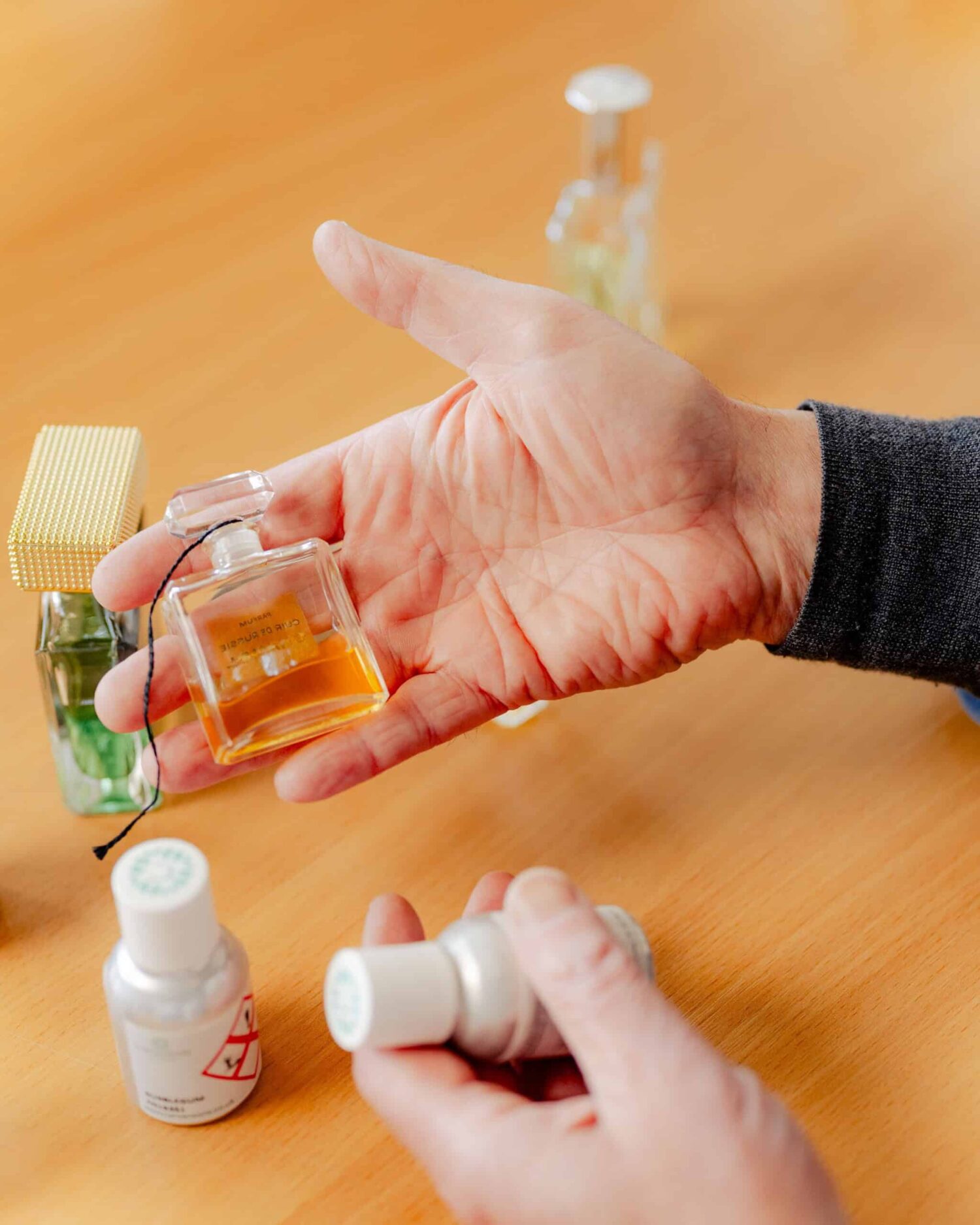 O’Shaughnessy volunteers his time, with some basic expenses covered by Novus. Perfumes – often expensive luxury brands – have largely been begged and bought secondhand. He takes tiny samples of each into workshops on strips of blotting paper.