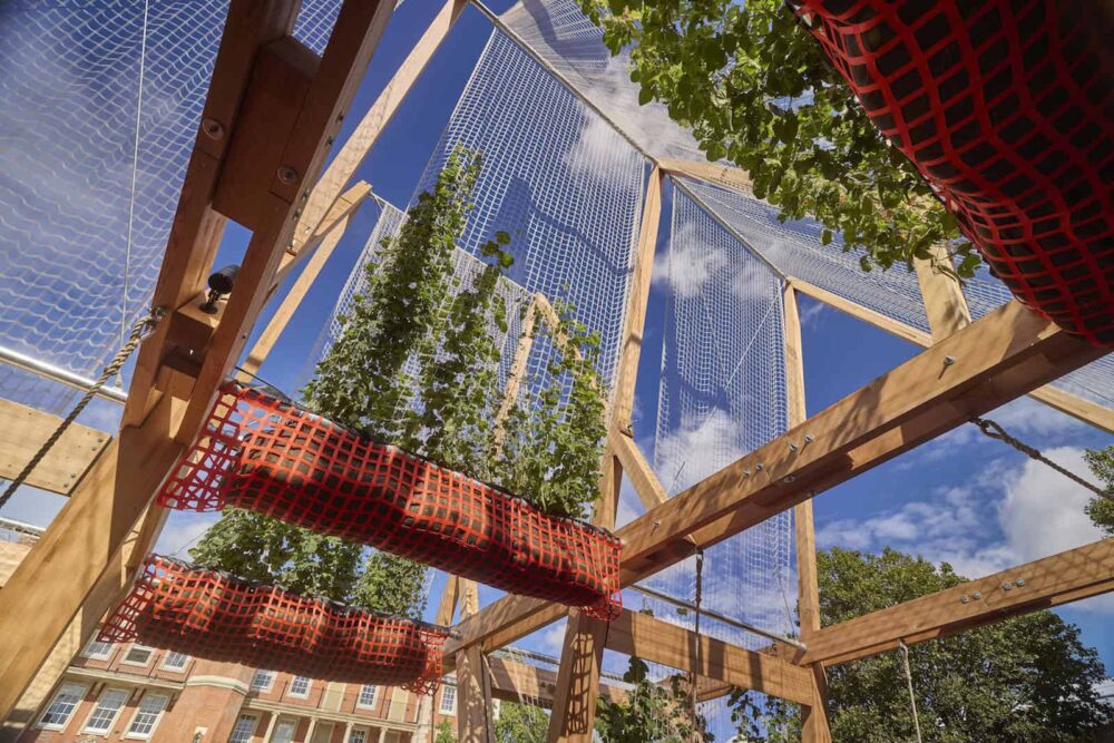 Vert is projected to cool the surrounding air space by as much as 8ºC, cast four times more shade than a 20-year-old tree, and produce as much biomass as an 80-year-old lime tree – all through the use of climbing plants grown over the course of a single summer.