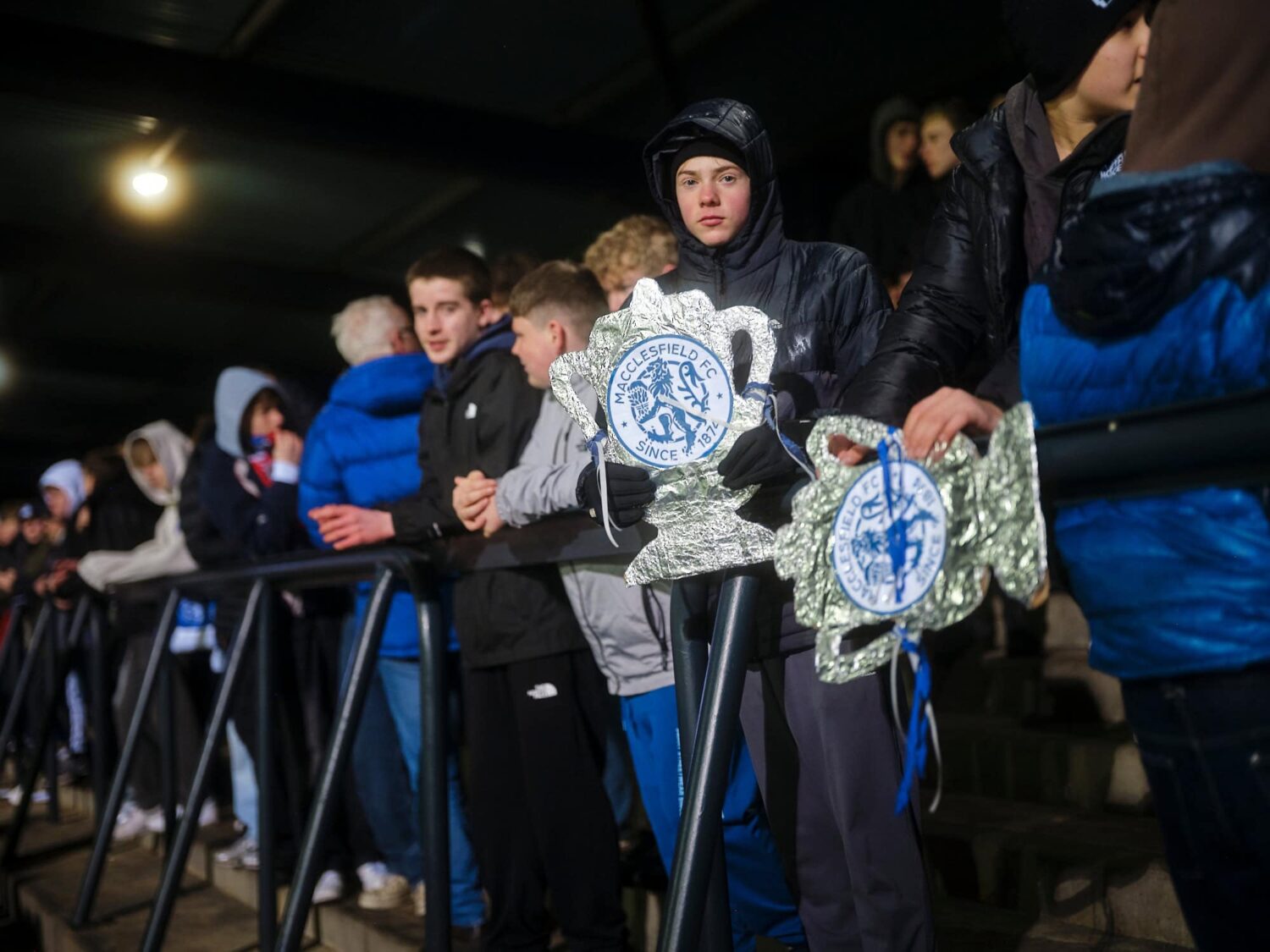 A cluster of young Macclesfield fans gather close together from behind the goal in the WRS Star Lane End.