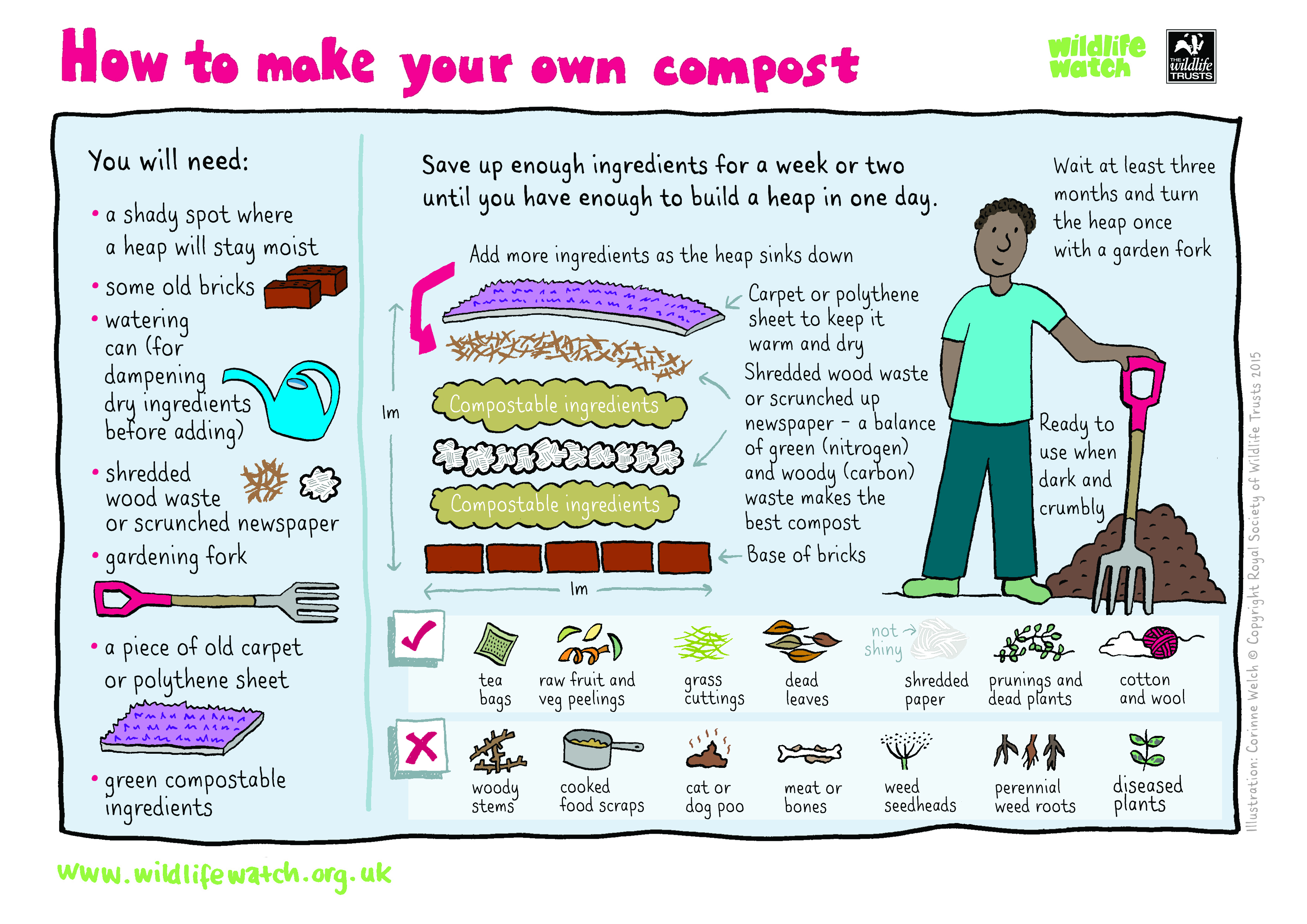 The list of items you can add to a home compost pile is as long as a day stuck inside with your family may sometimes feel. Strike out for the garden and create your very own heap in a shady spot where it will stay moist. Once you’re set up, fling in tea bags, raw fruit and veg peelings, grass cuttings, dead leaves, shredded paper, garden prunings and even waste cotton and wool. For more tips, including how not to rile your pile, click here.