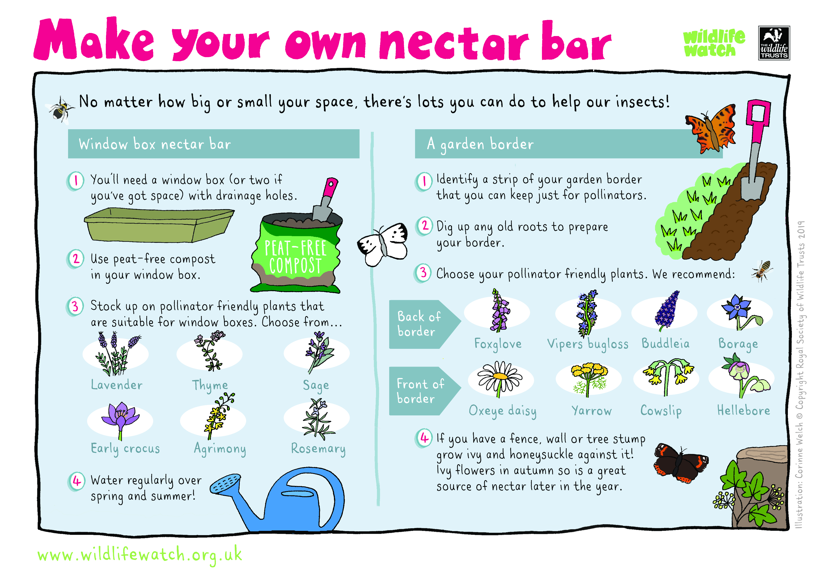 No matter the size of your green space, you can do plenty to help the UK’s pollinators. Pack a window box with insect-friendly plants: lavender, agrimony and rosemary are great examples, or dedicate a border of your garden to the same sweet-smelling aim. More information is here.