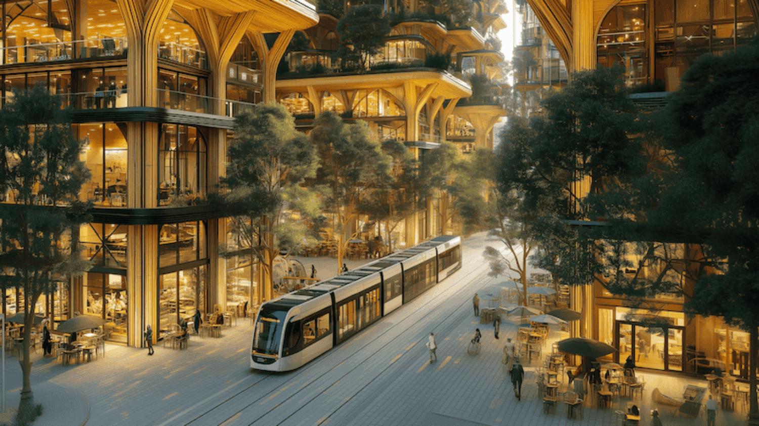 Wooden towers rise above the tree canopy, their facades alive with plants and shimmering solar cladding. The hum of traffic is gone. Instead, a quiet feet of autonomous robovans glides along dedicated lanes, linking neighbourhoods in smooth, predictable loops.