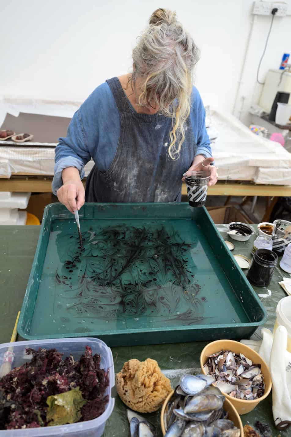 In AFYO’s case it was used to create pigments and ink for a roster of 16 artists including Antony Gormley and Anya Gallaccio. The latter added ground-down stones and mollusc shells to the ink to fashion a series of abstract seascapes.