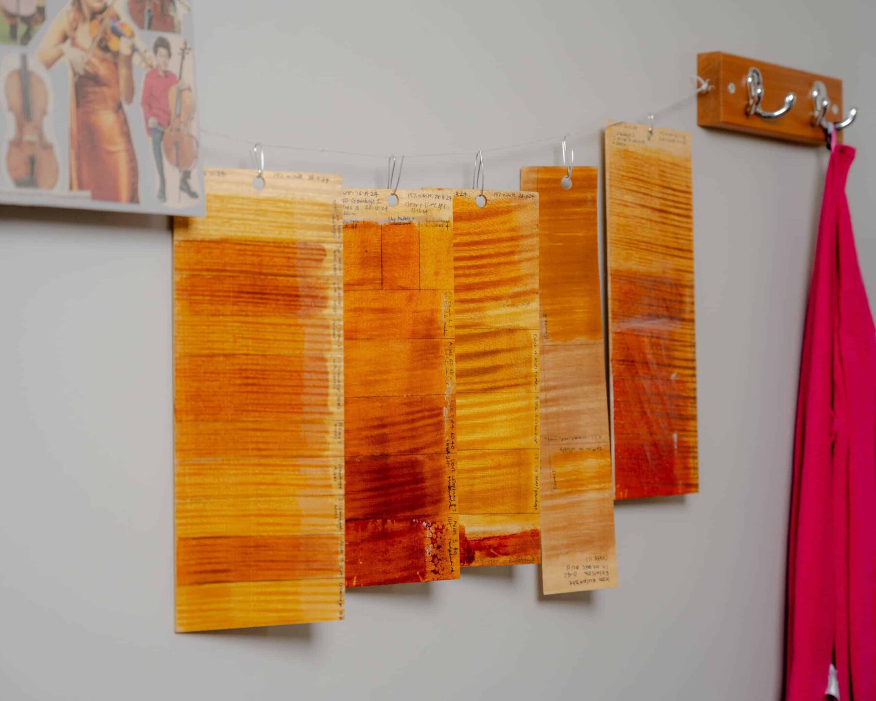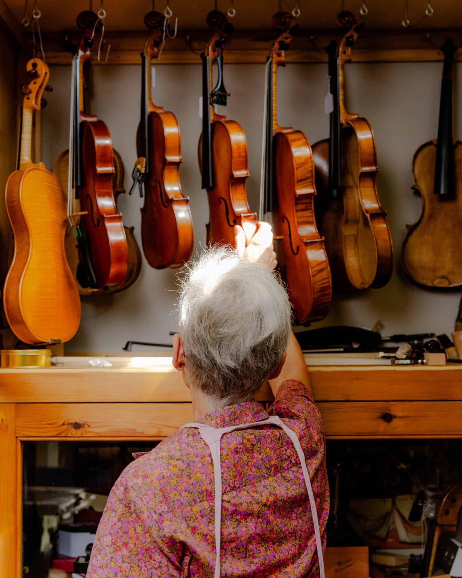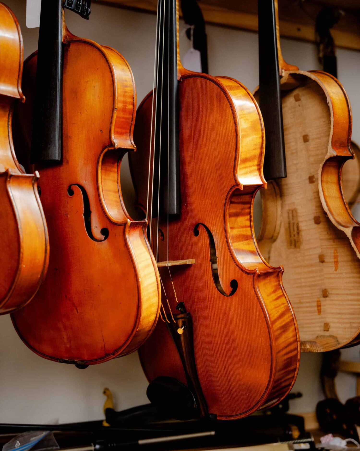 Violins catch the light in Helen Michetschläger's Manchester studio