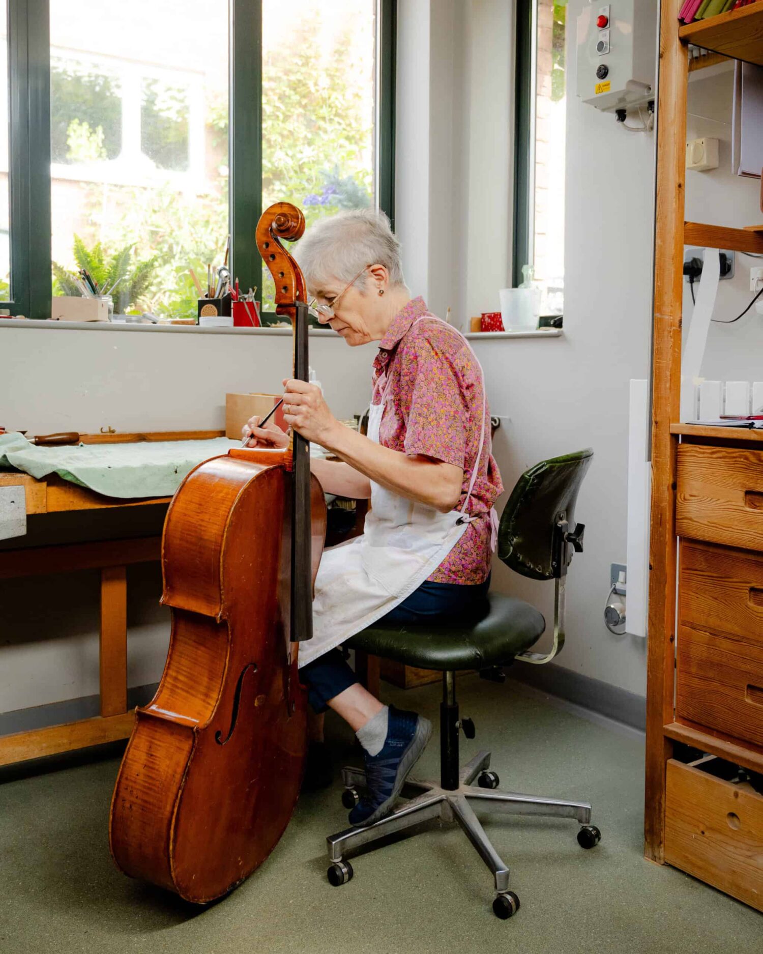 Helen Michetschläger repairs a broken cello