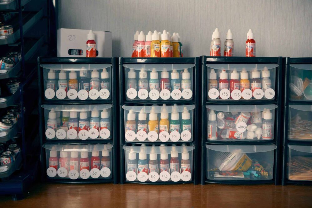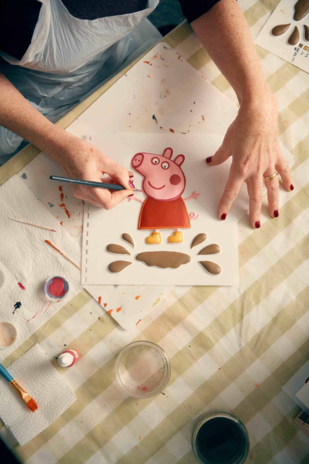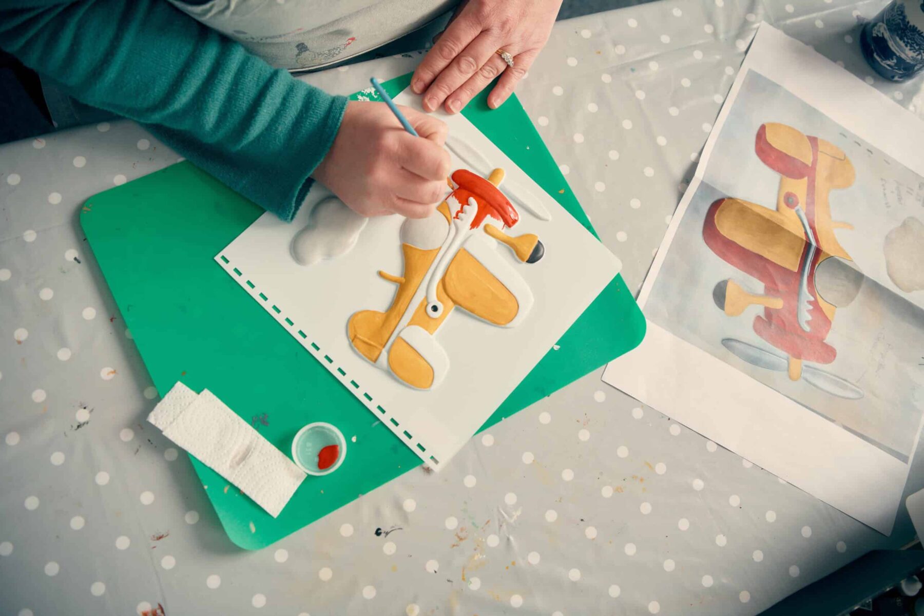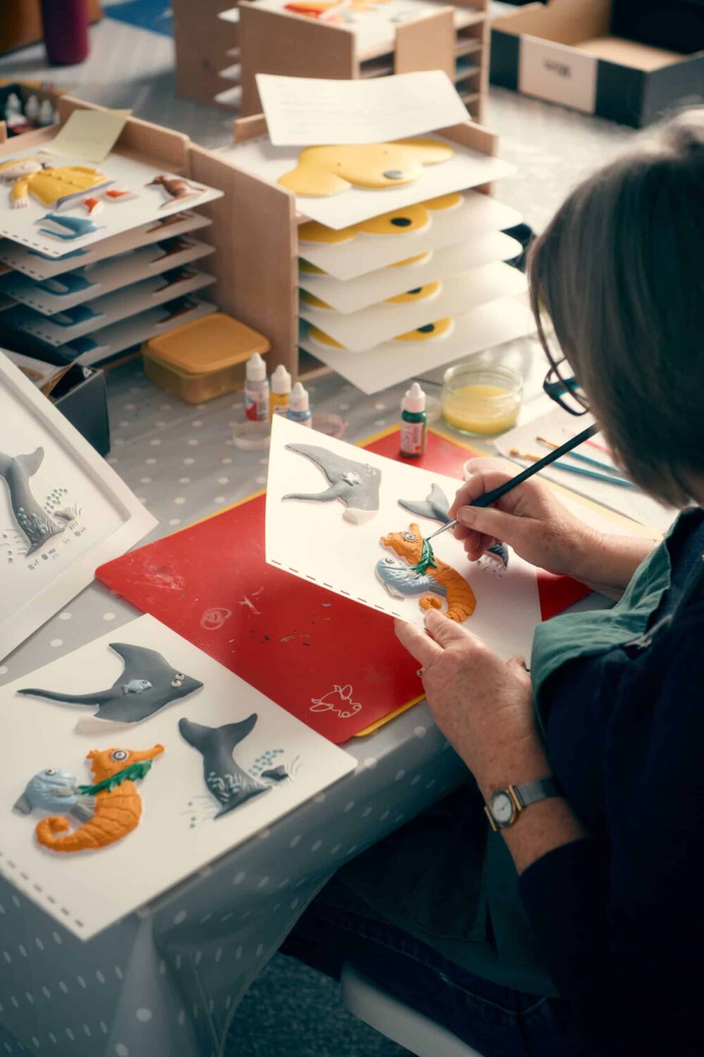 Once pressed, volunteers meticulously apply several coats of paint to each copy. Here, one volunteer paints a seahorse’s scarf, while another adds detail to a portrait of Peppa Pig. Pictures of Spot the Dog dry on racks in the background. Living Paintings has around 120 volunteers, from carvers and painters, to Braille proofreaders and scriptwriters, who write audio guides, as well as blind and visually impaired people who check the books are ready for the public.