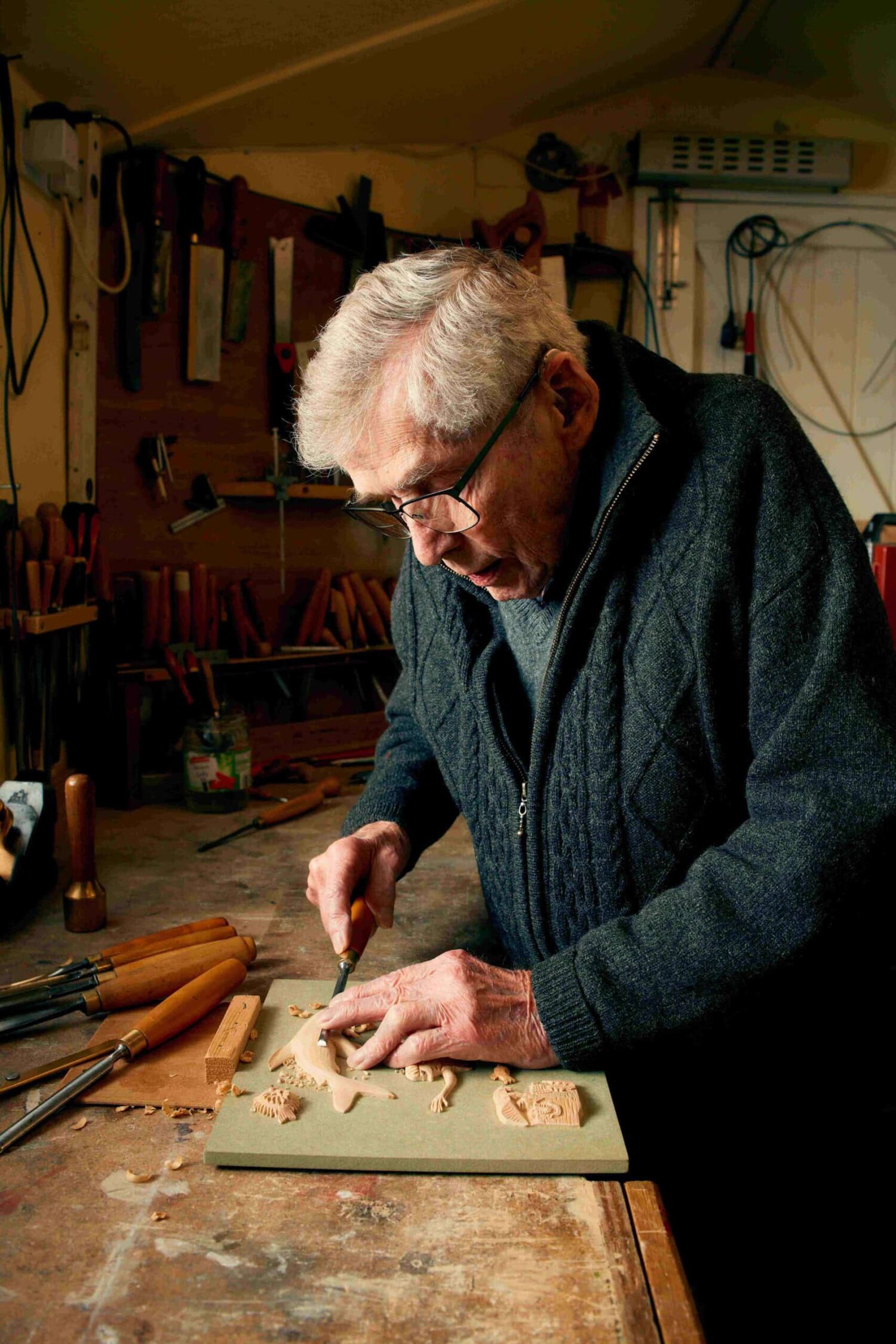 In his garage workshop, 88-year-old Len Webb uses a chisel to carve the underwater creatures that were originally illustrated by Axel Scheffer for Julia Donaldson’s picture book, Tiddler