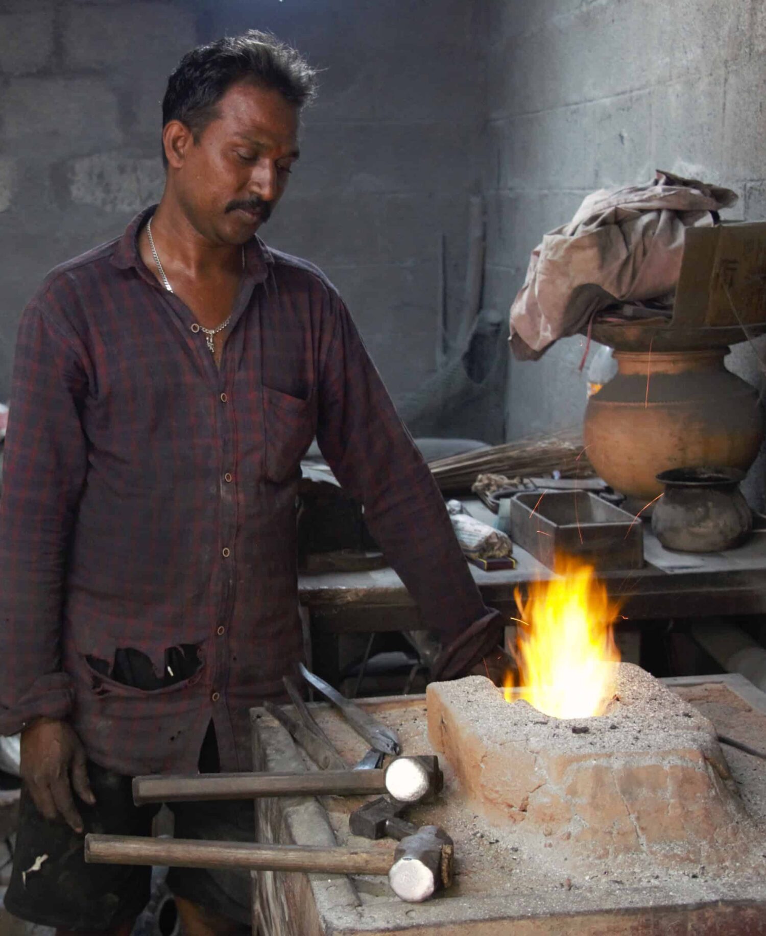 Shrinivas Acharya, a blacksmith in Ammunje nr Udupi, with a solar-powered blower forge