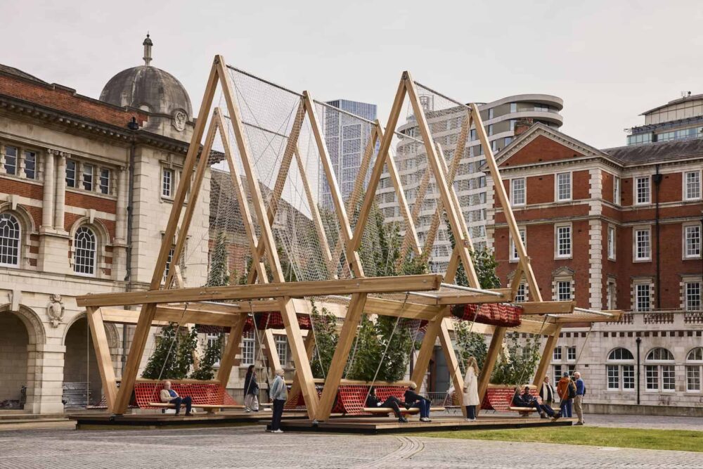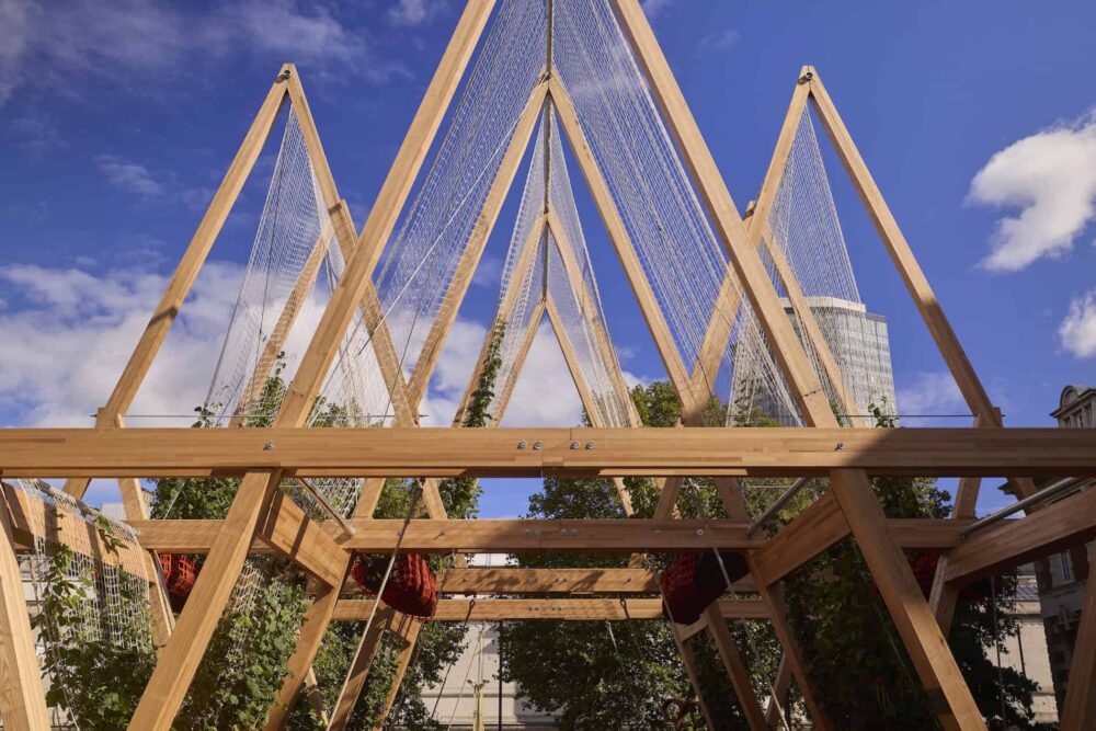 The project, Vert, is designed to address challenges that are common to urban areas, such as rising temperatures, heatwaves and declining biodiversity. Its red oak timber frames, fitted with fabric nets or ‘sails’, can support more than 20 species of climbing plants at once. Its designers say that it encourages nature into the city and creates sheltered spaces to gather.