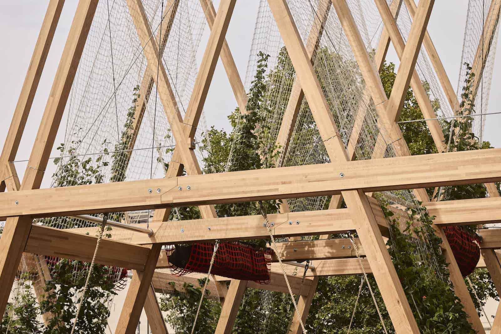Vert is a collaboration between Diez’ own design studio, Diez Office, the American Hardwood Export Council (AHEC), and urban greening specialist agency OMCºC. Constructed from an engineered hardwood, red oak glue-laminated timber – known in the industry as ‘glulam’ – the structure consists of a series of timber triangles that hold suspended biodegradable nets. Despite red oak being considered sustainable and constituting a hefty 18% of North American hardwood forests, it is underutilised in Europe.