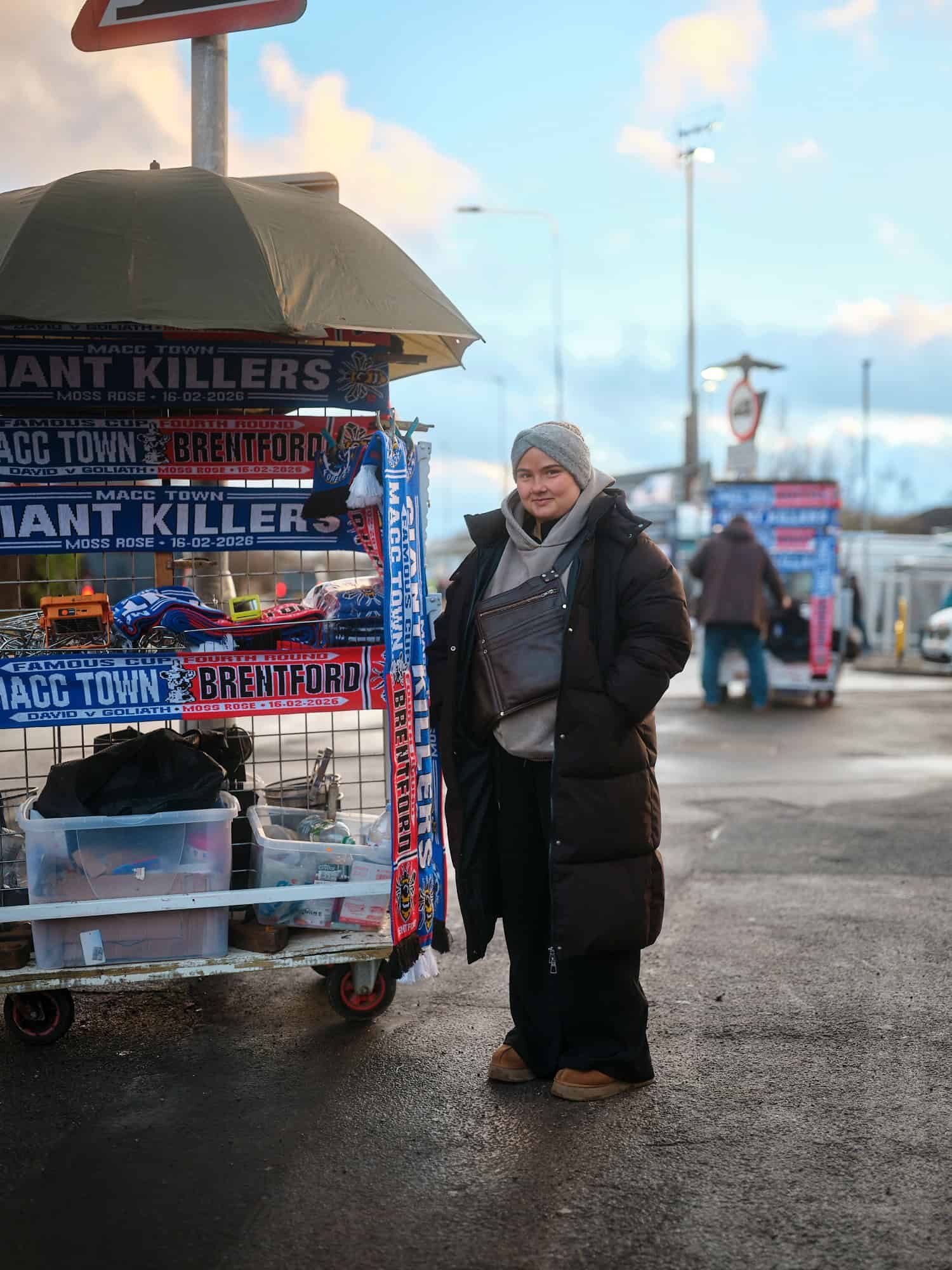 A merchandise seller has arrived to sell commemorative scarfs and other items, outside Macclesfield’s stadium before kick off.